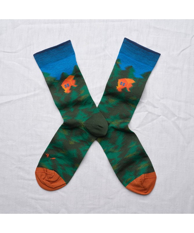 Les chaussettes Bonne Maison sont en coton égyptien pour les pieds fragiles. Leur fil double est chaud et lisse pour éviter les bouloches. Leur maille est fine pour le confort et la précision des motifs. Dessinées par Béatrice Crécy, ces chaussettes racontent des histoires aux univers tantôt poétiques tantôt farfelues. Chaque collection a son propre univers aux couleurs subtilement associées pour attiser notre œil, envelopper nos pieds de bonheur et faire pétiller nos tenues.