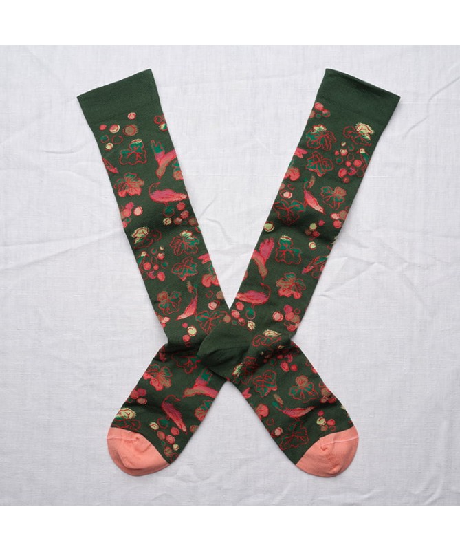 Les chaussettes Bonne Maison sont en coton égyptien pour les pieds fragiles. Leur fil double est chaud et lisse pour éviter les bouloches. Leur maille est fine pour le confort et la précision des motifs. Dessinées par Béatrice Crécy, ces chaussettes racontent des histoires aux univers tantôt poétiques tantôt farfelues. Chaque collection a son propre univers aux couleurs subtilement associées pour attiser notre œil, envelopper nos pieds de bonheur et faire pétiller nos tenues.