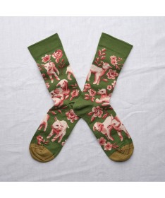Les chaussettes Bonne Maison sont en coton égyptien pour les pieds fragiles. Leur fil double est chaud et lisse pour éviter les bouloches. Leur maille est fine pour le confort et la précision des motifs. Dessinées par Béatrice Crécy, ces chaussettes racontent des histoires aux univers tantôt poétiques tantôt farfelues. Chaque collection a son propre univers aux couleurs subtilement associées pour attiser notre œil, envelopper nos pieds de bonheur et faire pétiller nos tenues.
