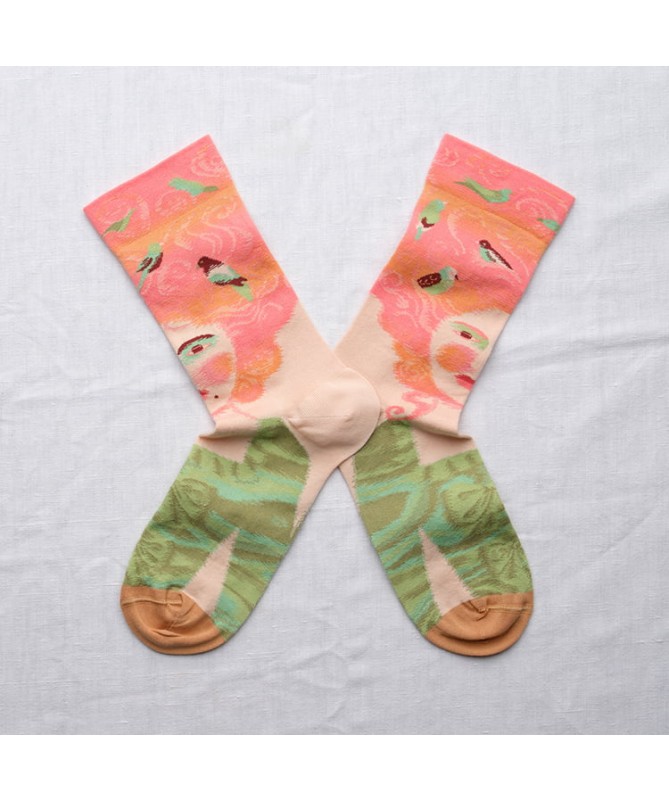 Les chaussettes Bonne Maison sont en coton égyptien pour les pieds fragiles. Leur fil double est chaud et lisse pour éviter les bouloches. Leur maille est fine pour le confort et la précision des motifs. Dessinées par Béatrice Crécy, ces chaussettes racontent des histoires aux univers tantôt poétiques tantôt farfelues. Chaque collection a son propre univers aux couleurs subtilement associées pour attiser notre œil, envelopper nos pieds de bonheur et faire pétiller nos tenues.