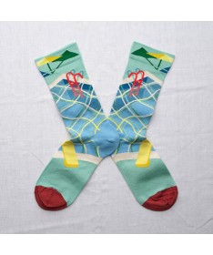 Les chaussettes Bonne Maison sont en coton égyptien pour les pieds fragiles. Leur fil double est chaud et lisse pour éviter les bouloches. Leur maille est fine pour le confort et la précision des motifs. Dessinées par Béatrice Crécy, ces chaussettes racontent des histoires aux univers tantôt poétiques tantôt farfelues. Chaque collection a son propre univers aux couleurs subtilement associées pour attiser notre œil, envelopper nos pieds de bonheur et faire pétiller nos tenues.